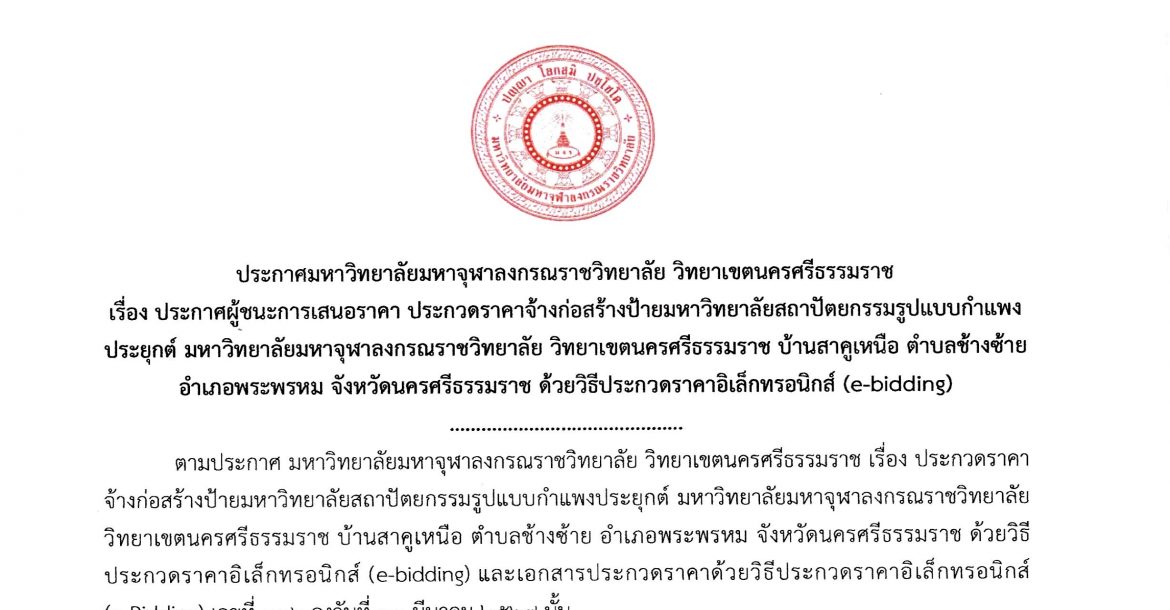 ประกาศผู้ชนะการเสนอราคา ประกวดราคาจ้างก่อสร้างป้ายมหาวิทยาลัยสถาปัตยกรรมรูปแบบกำแพงประยุกต์ มหาวิทยาลัยมหาจุฬาลงกรณราชวิทยาลัย วิทยาเขตนครศรีธรรมราช บ้านสาคูเหนือ ตำบลช้างซ้าย อำเภอพระพรหม จังหวัดนครศรีธรรมราช ด้วยวิธีประกวดราคาอิเล็กทรอนิกส์ (e-bidding)